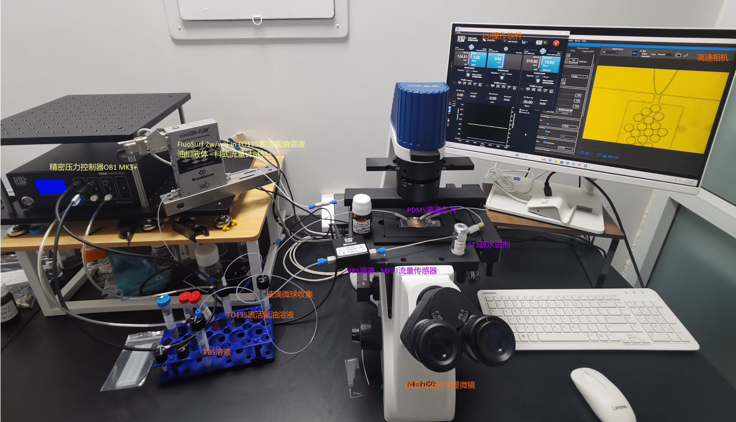 多通道压力流量控制器OB1 MK3+用于驱动15mL样品储液池内的试剂溶液流动,科式流量计BFS1+用于油相/外相溶液的恒定流量控制,MFS3数字流量传感器用于内相/水相溶液的恒定流量控制。PDMS液滴芯片自行定制加工,缩口宽度和深度均为50μm,连接方式:直接插入导管,不需要任何夹具。