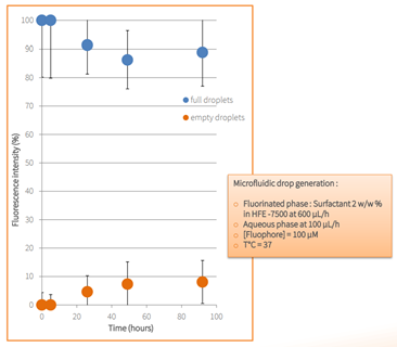 FluoSurf 表面活性剂限制液滴之间的交换(4天后少于10%的荧光素交换)