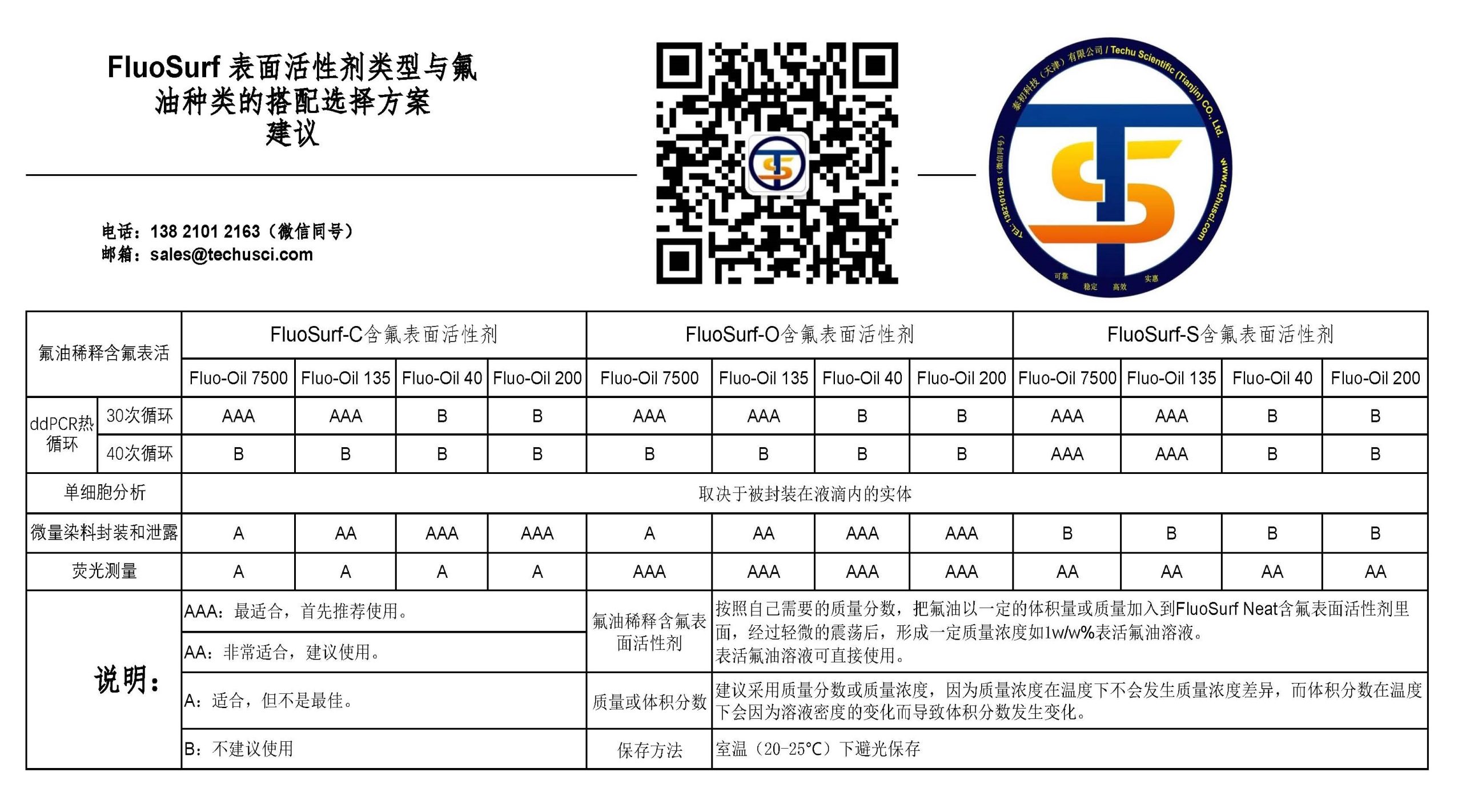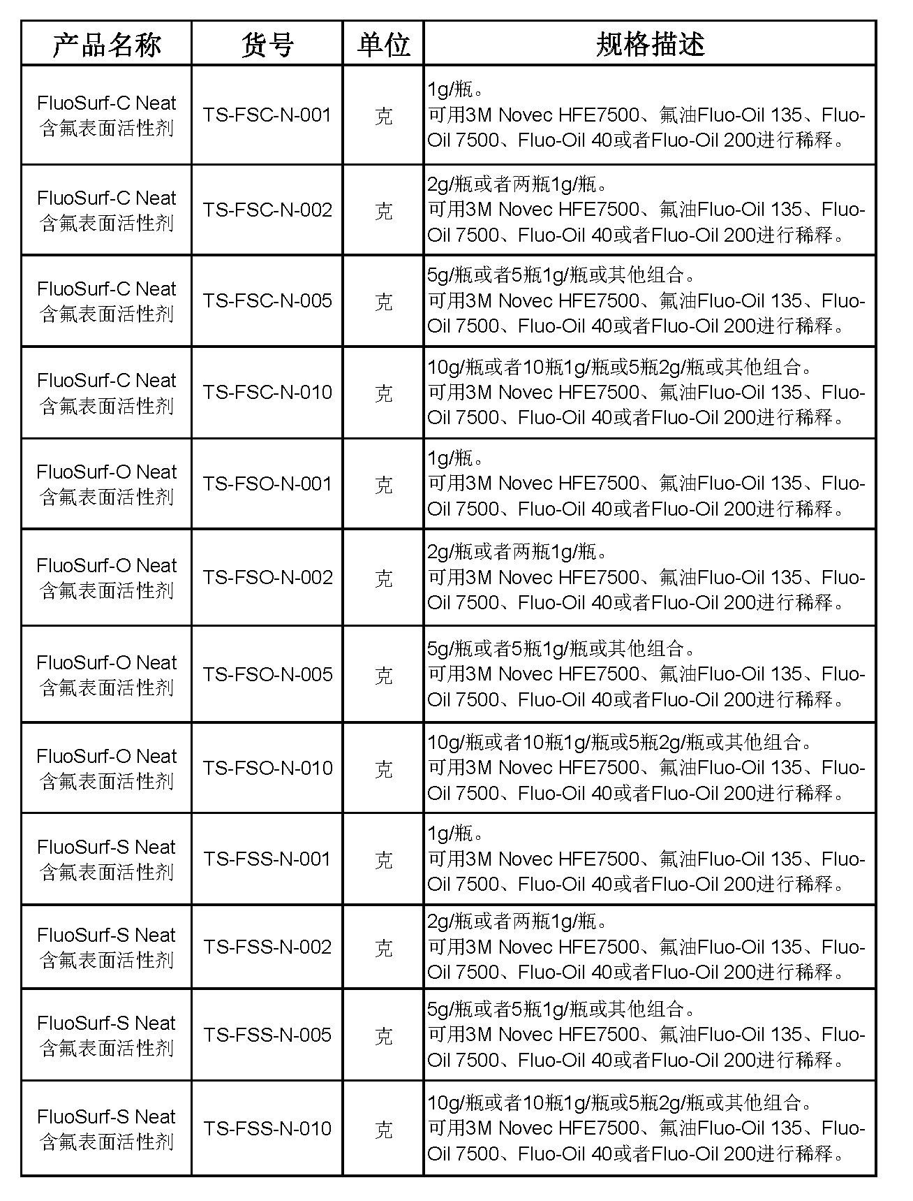 ● FluoSurf-C Neat:适用于基于液滴微球的各类实验如ddPCR、单细胞分析、单细胞分选/picoinjection、细胞液滴测序、蛋白酶定向演化、油包水类液滴微球、GUV巨型囊泡等。