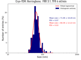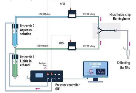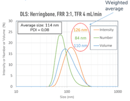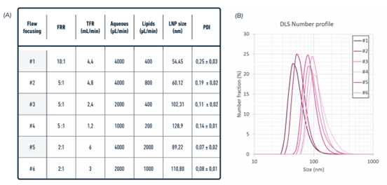 由PC(聚碳酸酯)或COC(Topas)材质加工而成的鱼骨型混合器(Staggered Herringbone Micromixer,SHM),又被称为人字型混合器,是通过类似鱼骨形结构的通道来混合两相液体,通过控制两相液体的总流速TFR和流速比FRR,实现不同粒径尺寸的纳米颗粒如LNP、siRNA-LNP、mRNA-LNP、PLGA和聚合物纳米颗粒等的制备。