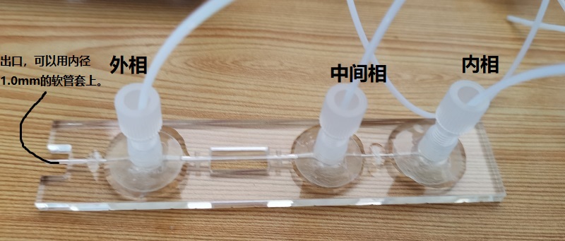2,如果使用注射器注射溶液,最内相液体尽可能采用1ml注射器,中间相和最外相可以使用5ml注射器。参考流速分别为:0.7ml/h,0.6ml/h,1.6ml/h。
